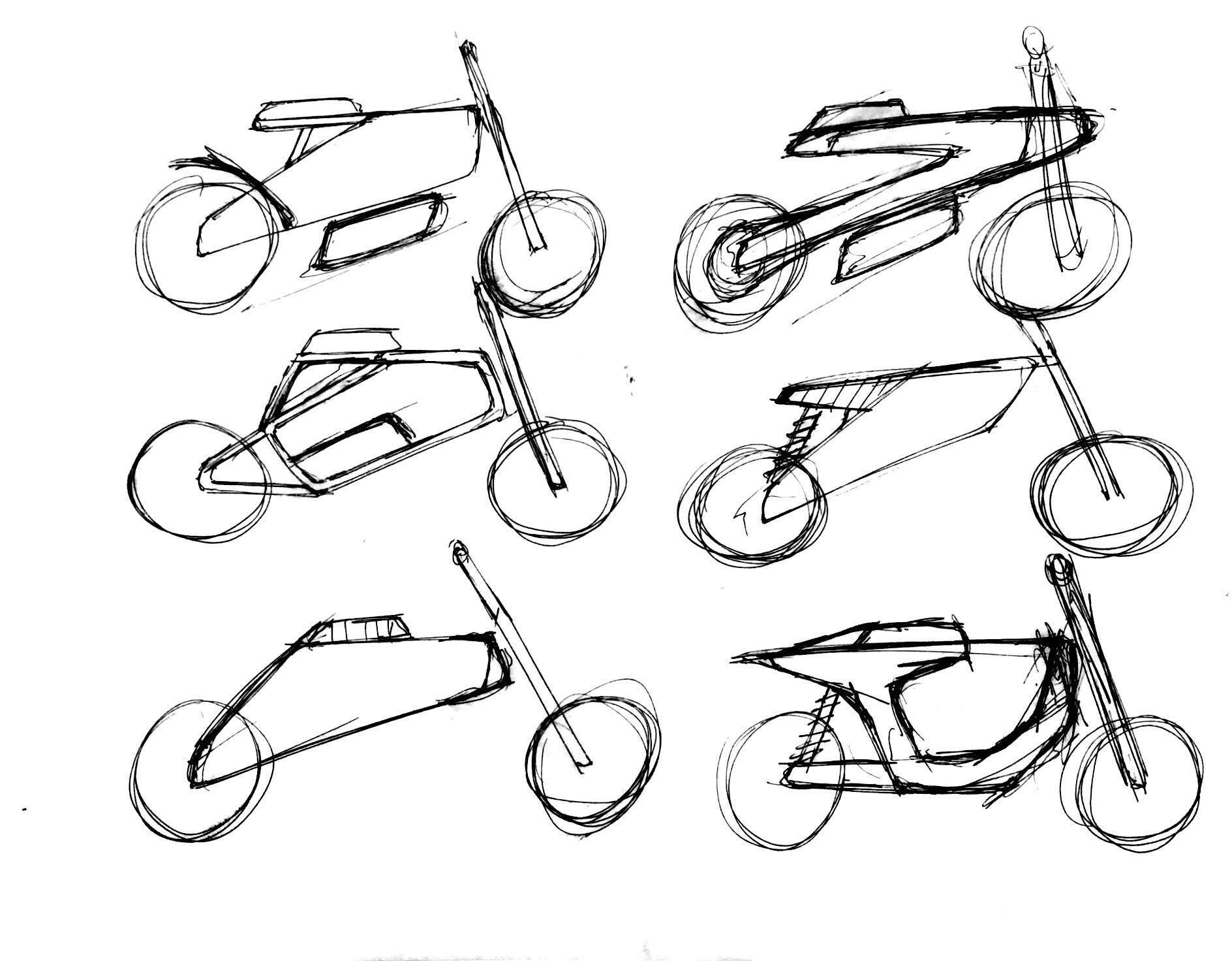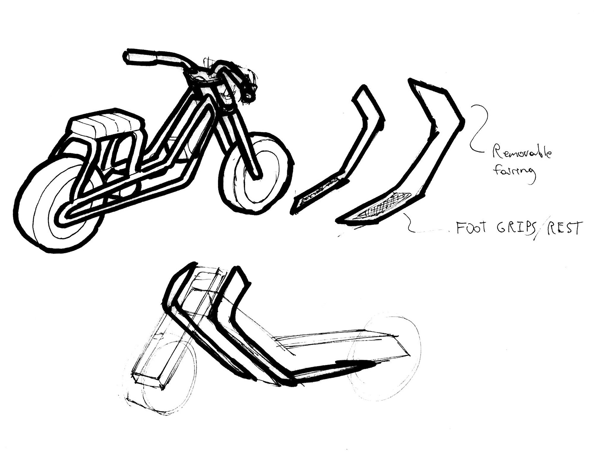 Early ideation focused on creating a simple and recognizable profile while also experimenting with different kinds of frame construction. Ideas for different modular components such as removable fairings were also explored and would influence the modular aspect of the design later. As the ideation progressed, the design moved toward a traditional step-through scooter design to make Joyride more practical and approachable, and to make it more recognizable as a 50cc style scooter.