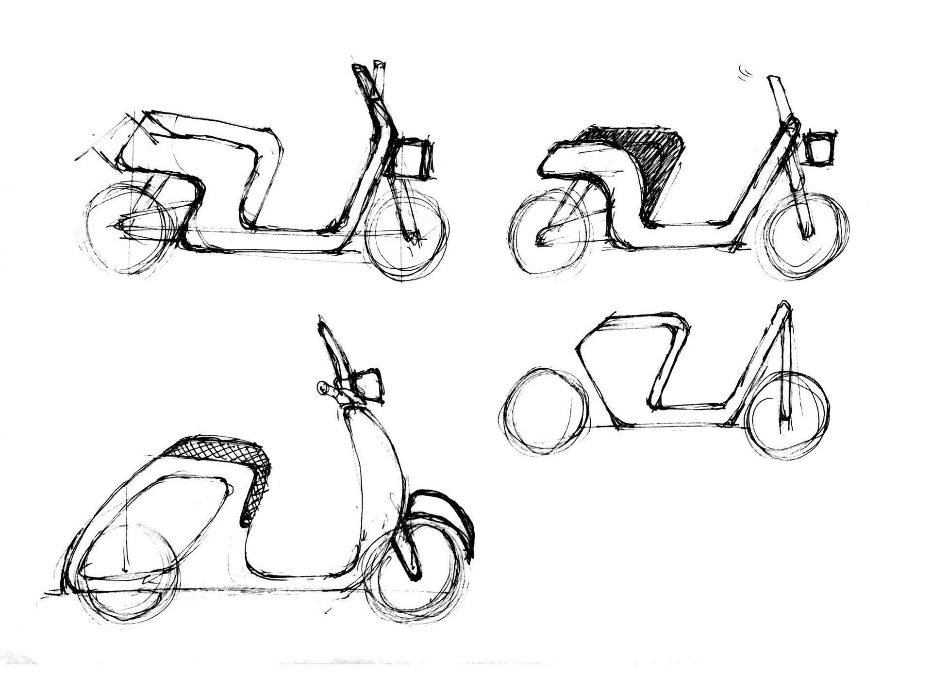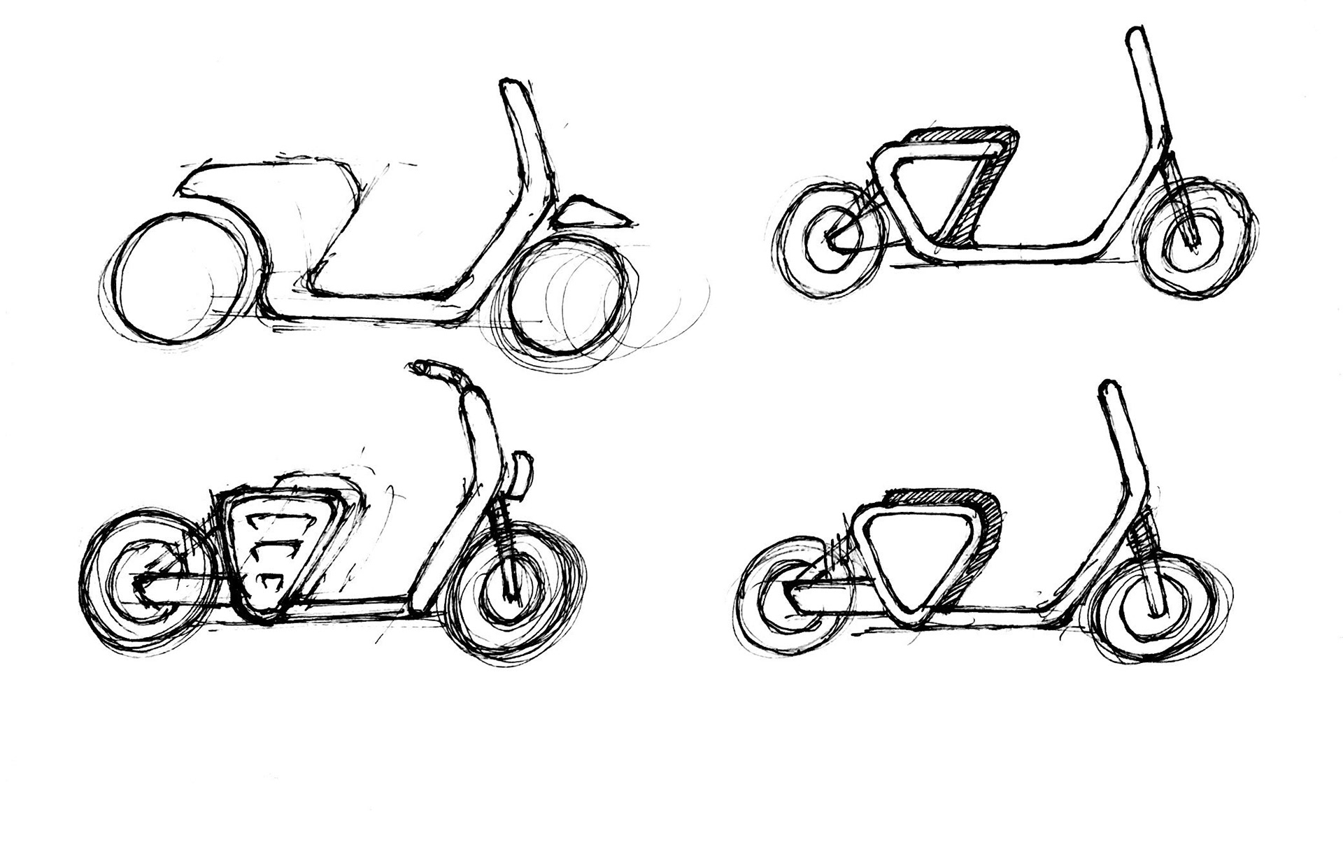 The many iterations were refined into a concept that focused on a simple form that could be achieved with the electric drivetrain. The different sections of the scooter were easily recognized as distinct modules with the rear portion of the scooter forming a distinctive triangular shape.